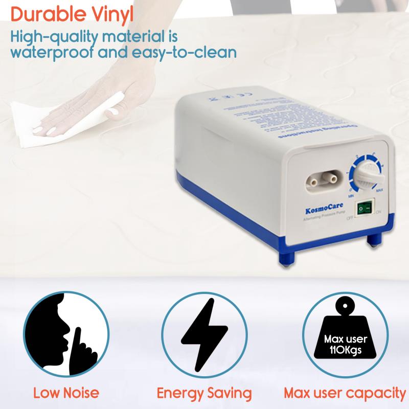 - Alternative pressure redistribution system: Air cells of the alternating pressure pad would be automatically inflated and deflated alternately through the consistent cyclic airflow to create a therapeutic sleeping surface, which helps optimize weight redistribution and reduce pressure spots, effective in the prevention and relief of ulcers, an essential for a patient who has to lie for long.