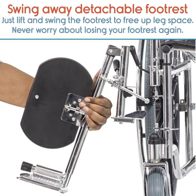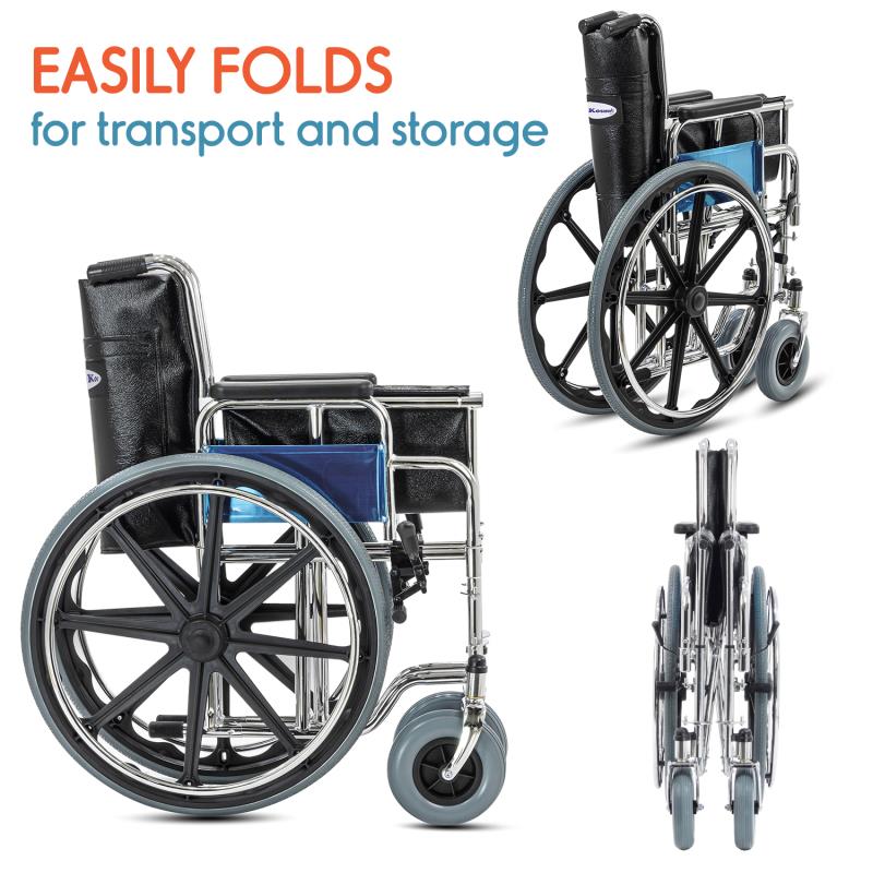 - Folding wheelchair with flip type armrests for easy transfer to/from bed.