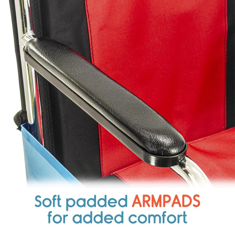 - Premium folding wheelchair with fixed armrests and foot rests.