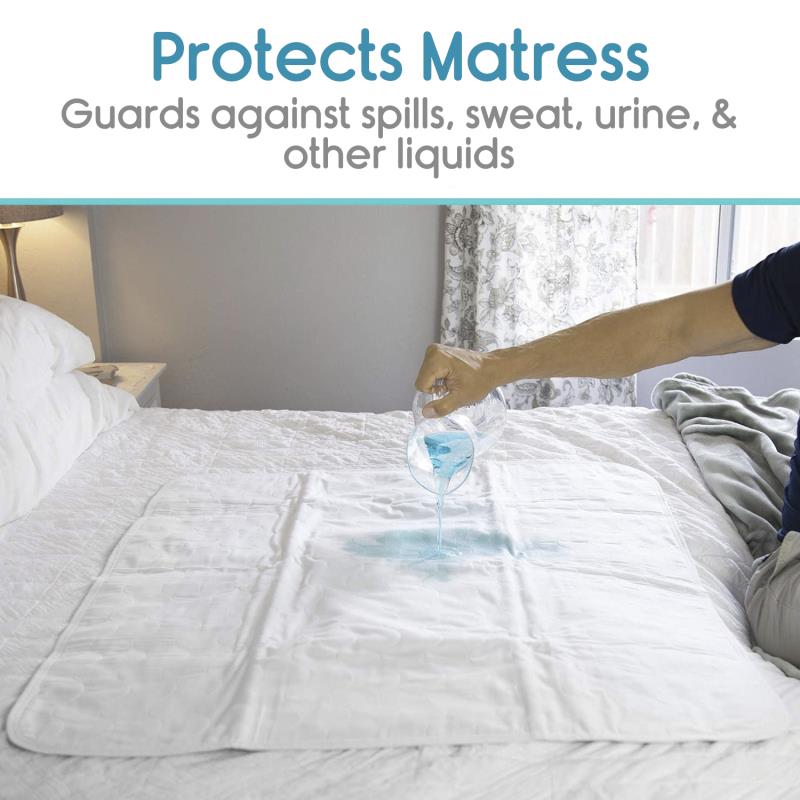- QUILTED SHEET FOR EXTRA PROTECTION: The quilted layered soft bed pads are designed to lock in moisture and has three layers that work together to protect against leakage. The Top layer is 50% Cotton 50% Polyester which feels comfortable to the skin. The middle layer consists of blended 95/05 poly rayon heavy weight soaker. The bottom layer is a waterproof knitted vinyl barrier.