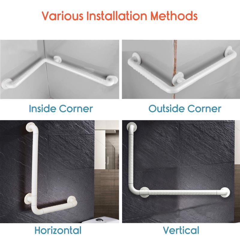 - VARIOUS INSTALLATION METHODS: A 90-degree, L-shaped grab bar can be fixed to the front wall of a bathroom, so the vertical part can be used when stepping in and out of the tub or shower and the horizontal part can be to steady oneself once inside the bathtub or shower area. L shaped grab bar has attachment points that allow it to be fixed horizontally in the outer corner between two walls as well the inner corner of a toilet.