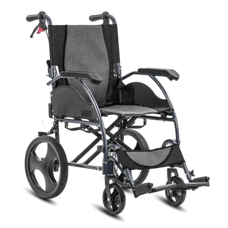 - Folding premium transporter wheelchair with fixed armrests and flip up foot rests and comes with a seat belt.