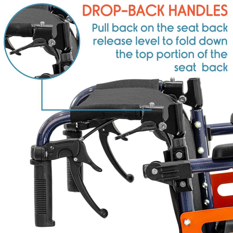 - The drop back-handle release hinge allow the back to fold down for easy storage and transport.
