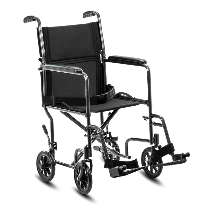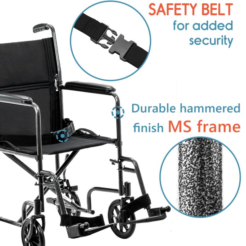- Folding transporter wheelchair which has smaller wheels thus making it light and compact for transporting.