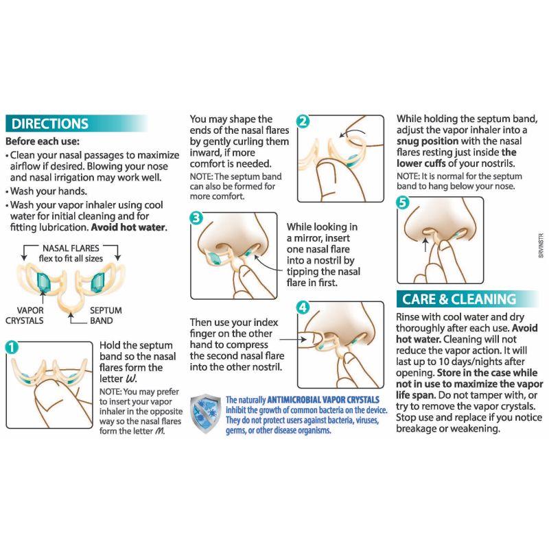 The SleepRight Intra-Nasal Vapor Inhaler helps increase airflow with the added benefit of soothing menthol vapors. Breakthrough breathe aid technology opens the nose 53% to increase airflow, while vapor crystals deliver sustained-release, soothing menthol. The non-medicated vapor crystals contain camphor, menthol, and eucalyptus. Each Vapor Inhaler is reusable for up to 10 days/nights of continuous soothing vapors.